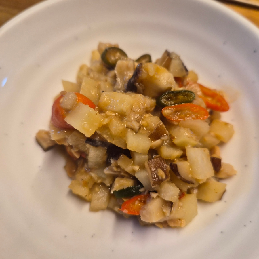 히카마 주먹 크기만큼, 감자 1개, 표고버섯 5장, 홍고추 1개, 청양고추 1개, 된장 2 숟가락-3숟가락,