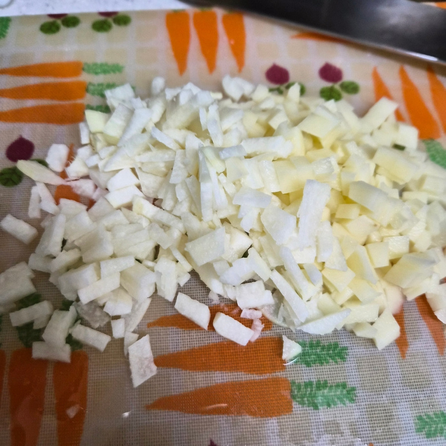 히카마와 감자를 작게 잘라줍니다. 씹히는 맛이 들 수 있도록 곱게 말고요. 쑹덩쑹덩 작게 잘라 줍니다.
