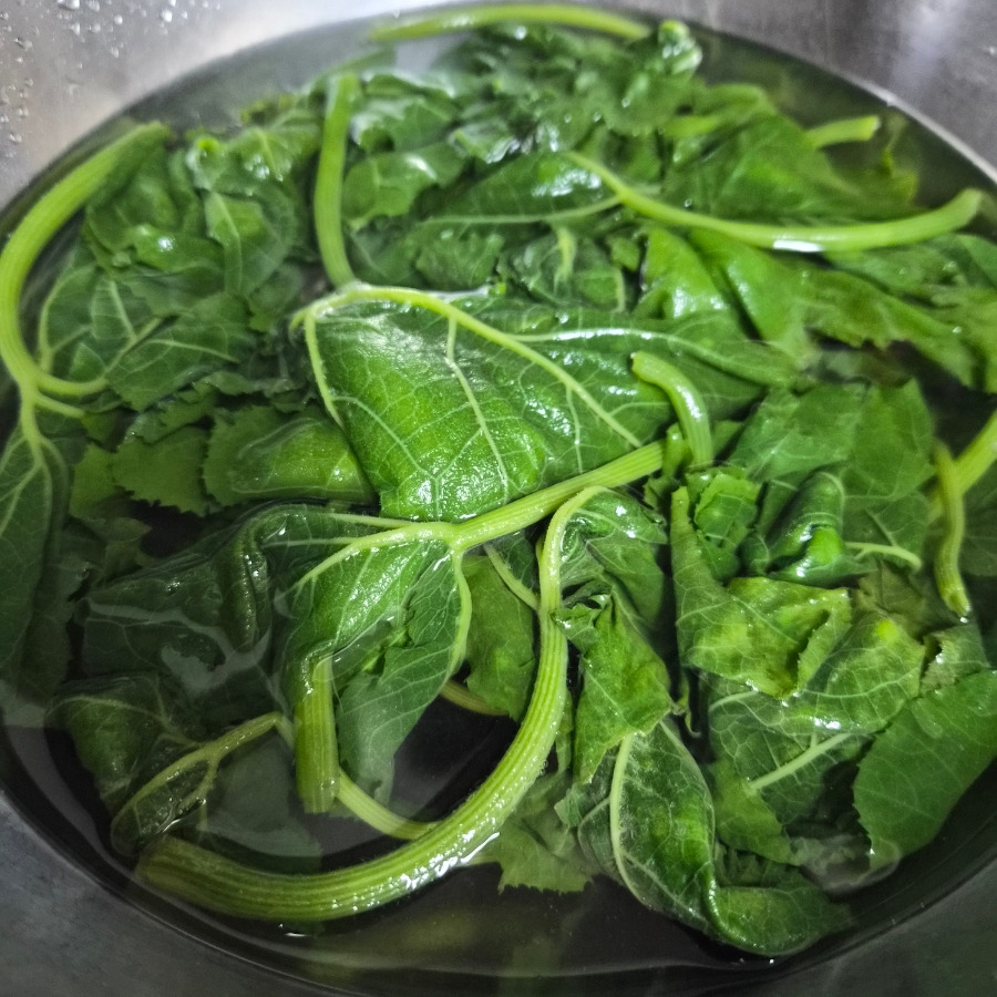 촉촉하게 쪄진 호박잎을 꺼내 찬물에 헹궈줍니다. 뜨거운 열기를 얼른 제거해야 합니다.