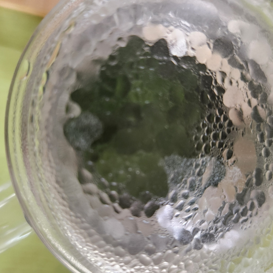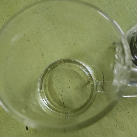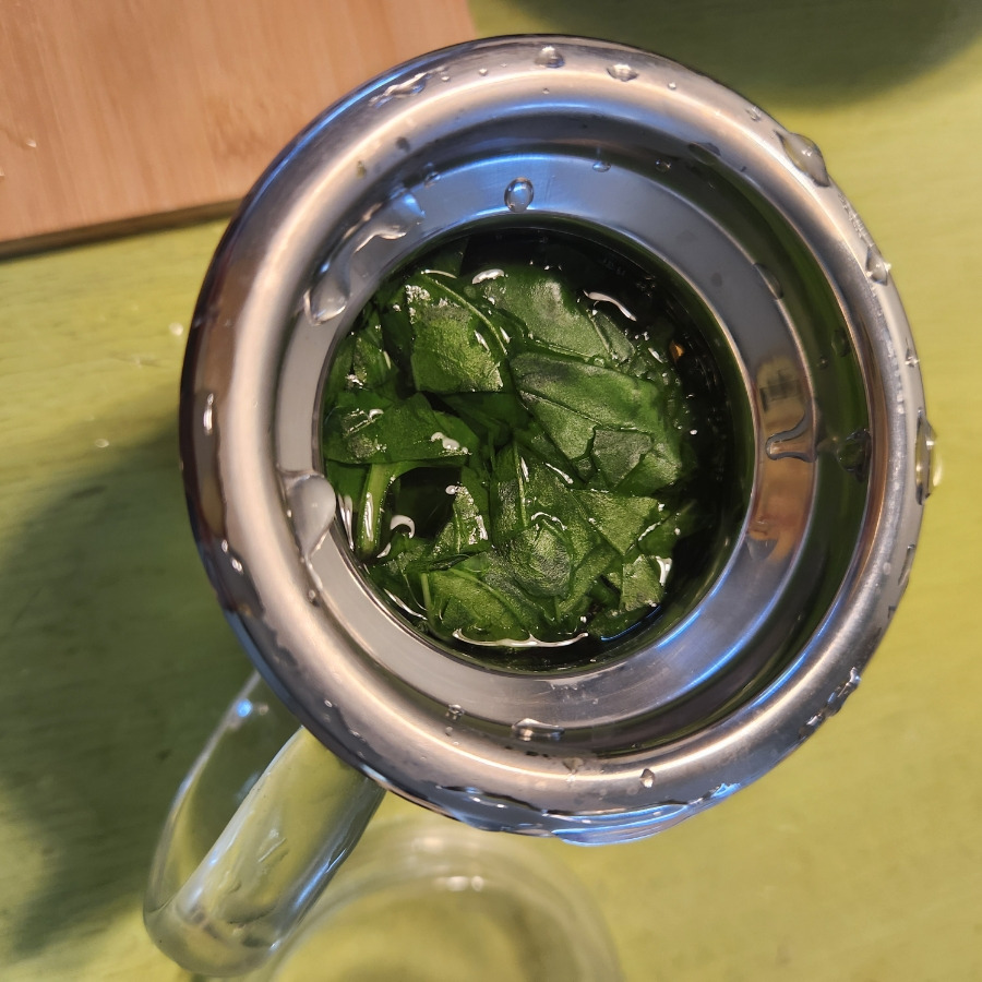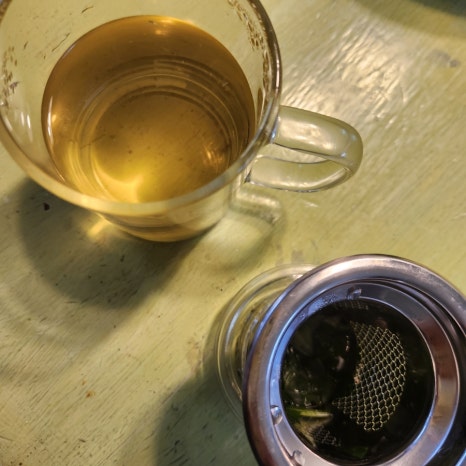 물을 붓고 한참을 기다려 차 망을 꺼내요. 미지근한 바질 차가 완성되었어요.