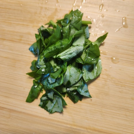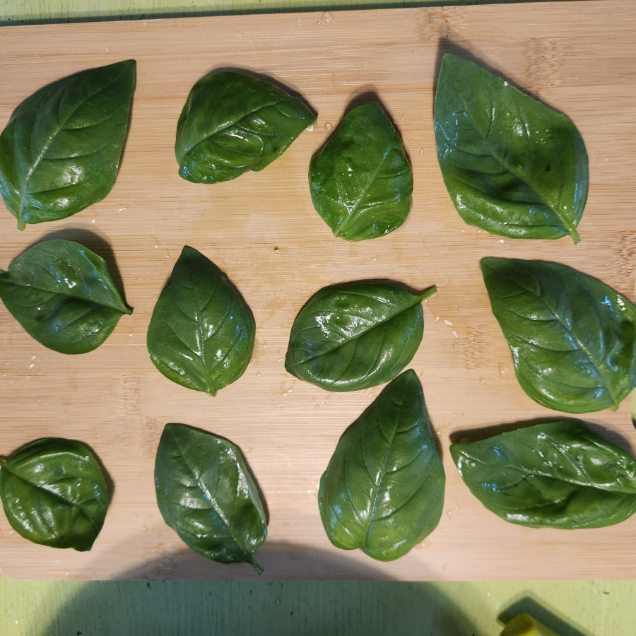 바질을 듬성듬성 잘랐어요. 바질을 5장 모아서 잘랐어요.