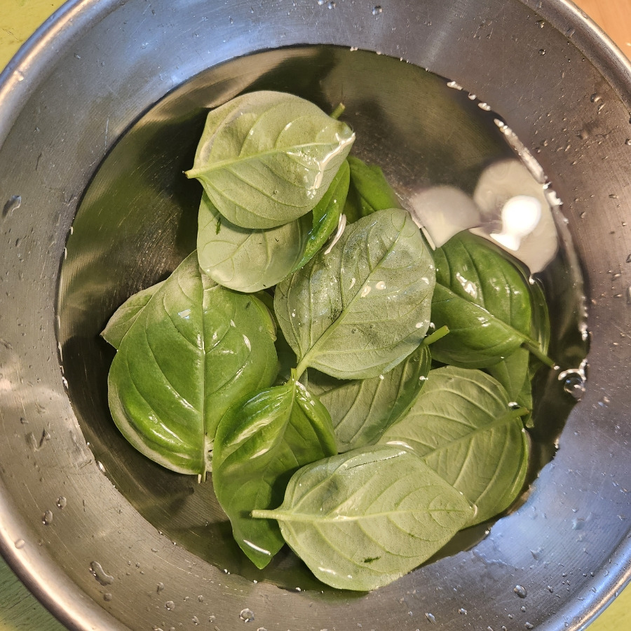 지난 일요일에 따서 와서 냉장고 속에서 자던 바질을 꺼냈어요.