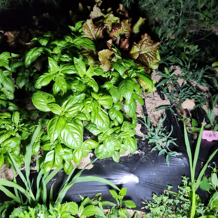 요건 농막 옆 밭 귀퉁이에서 자라고 있는 바질을 야밤에 촬영했어요. 들깨 북주기까지 하고 가느라 많이 늦었어요. 깜빡 잊고 바질과 브로콜리 수확을 잊었어요.