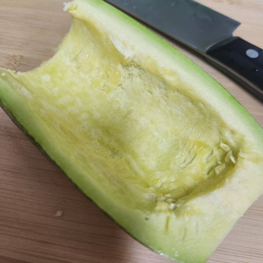 씨앗을 제거한 호박이에요. 1주일 사이에 큰 호박이 되어 씨앗이 크게 생겼어요. 숟가락으로 박박 긁어 씨앗을 제거합니다. 애호박은 정말 열심히 큽니다. 아차 하는 순간~ 바주카포로 변신합니다.
