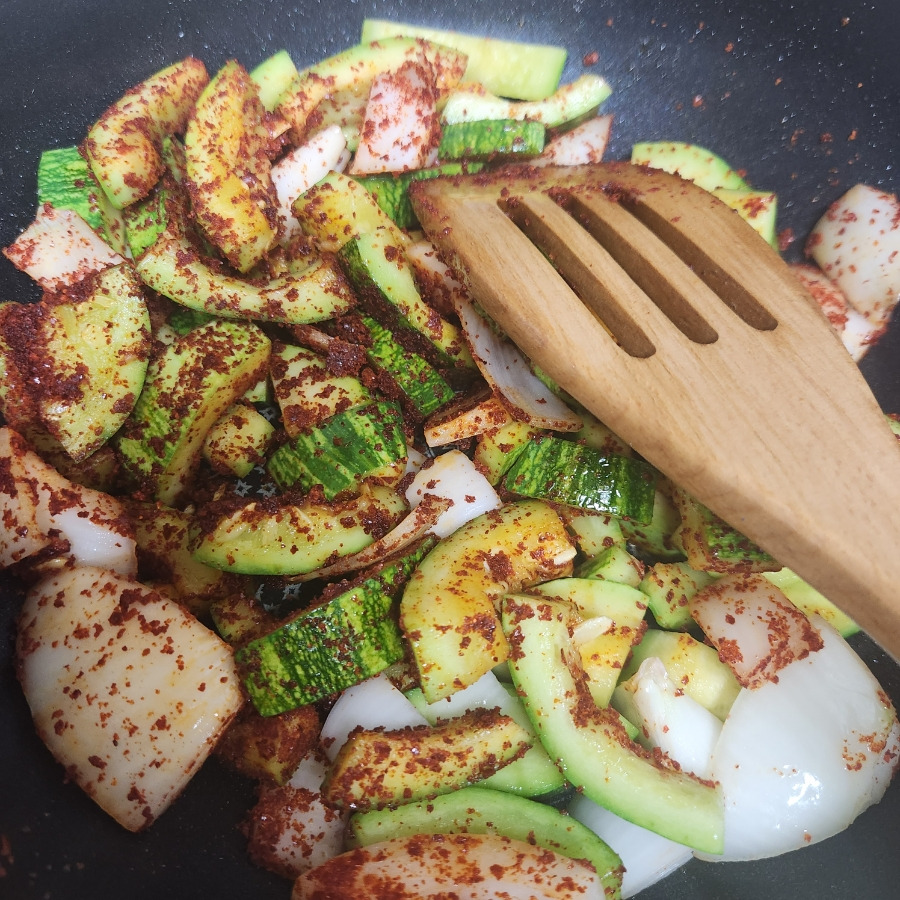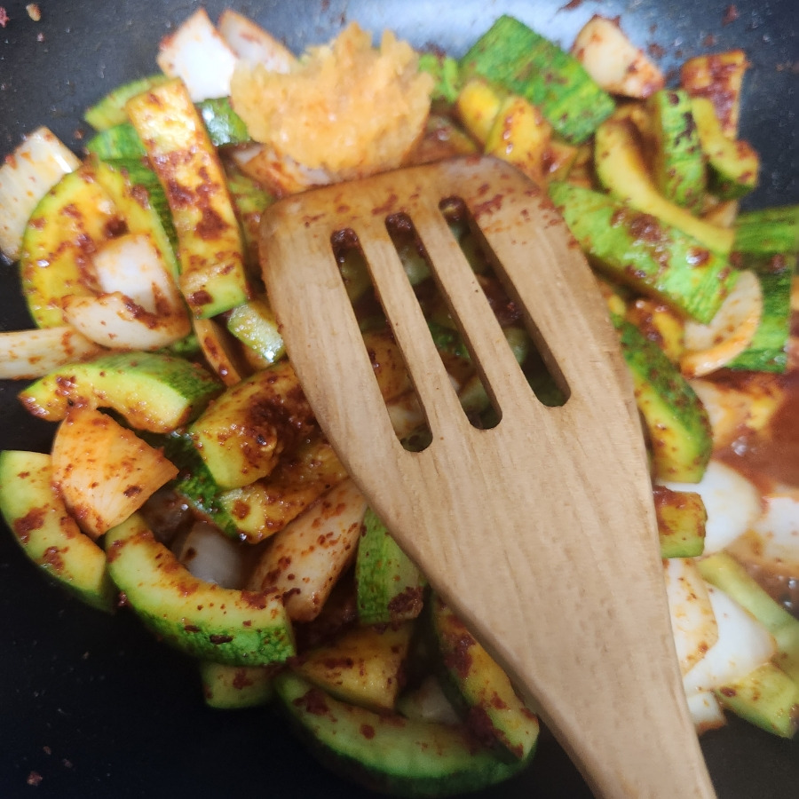- 호박을 볶다가 고춧가루를 넣고 볶아요. 그리고 간 마늘을 넣어요. 마늘 향을 느끼고 싶으면 마지막 끓일 때 넣어 주세요.