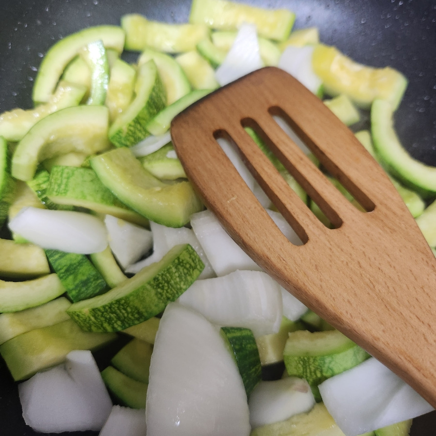 - 달군 프라이팬에 들기름과 식용유를 넣고 호박과 양파를 넣고 볶아 줍니다.