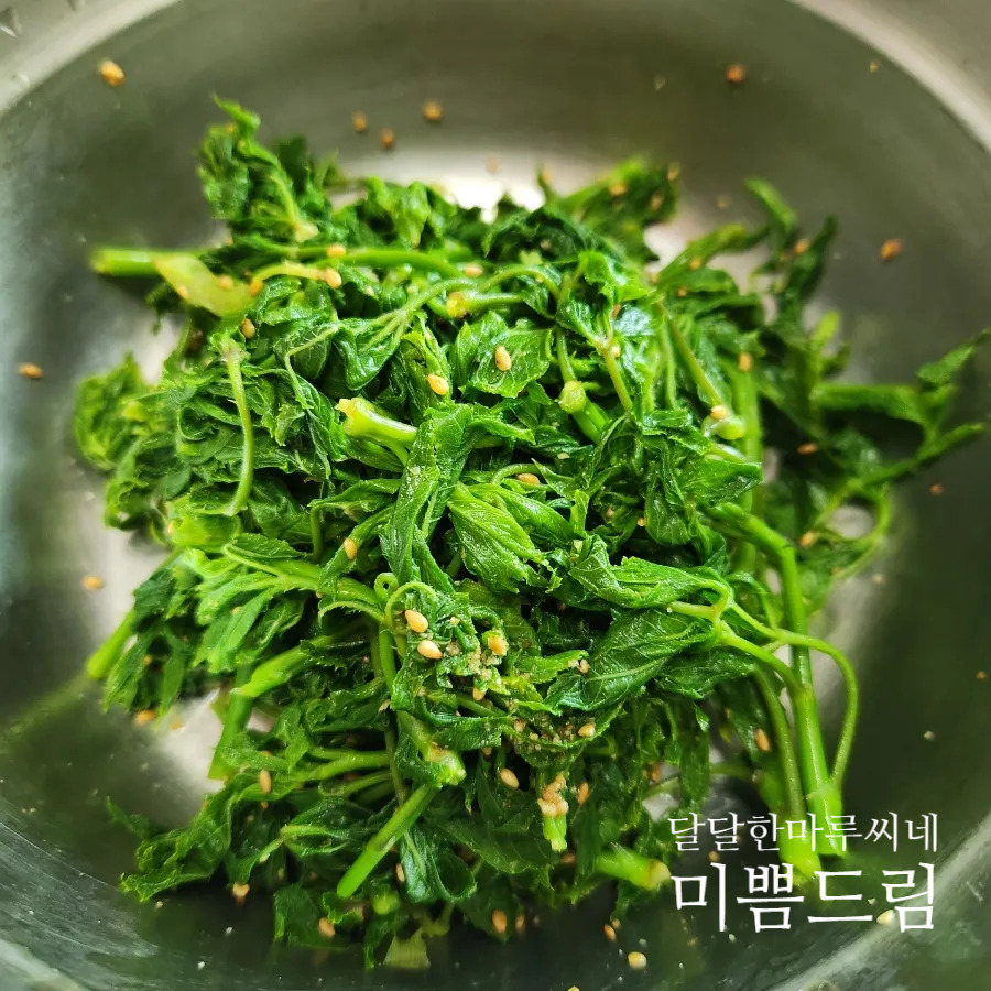 꺼내서 찬물 샤워하고요. 꼭~ 짜서 꼬기랑 함께 하면 좋아요.