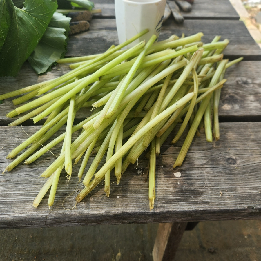 차광막 아래에서 머위 잎을 꺾어서 쭉~ 잡아당기면 머위 줄기의 섬유질이 벗겨집니다.