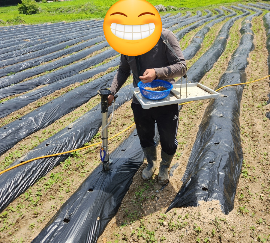 이식기를 이용해서 물을 먹은 땅속에 히카마 씨앗 2알씩 넣어 줍니다.