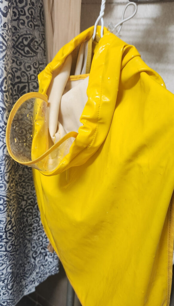 오늘 할 일을 마친 비옷은 물 샤워를 하고 옷걸이에 걸려요.