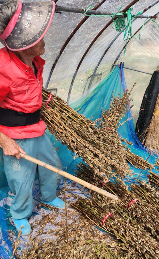 지난주 참깨를 밭에서 수확한 참깨를 잎을 떼고 단으로 묶어 주고 그리고 하우스 안에 묶음으로 세워주었죠. 그렇게 1주일을 보냈어요. 많이 말랐어요.