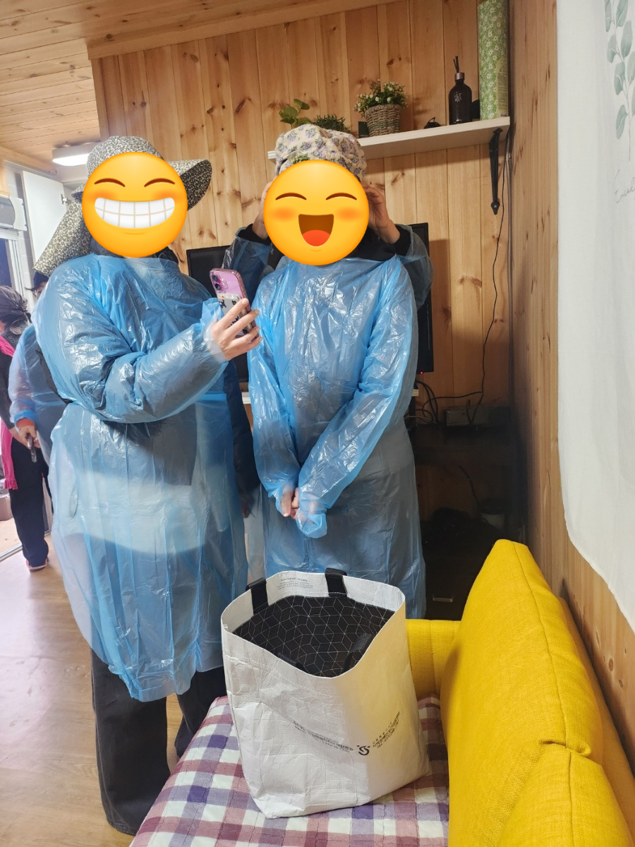 퍼런 비닐 앞치마 옷을 입고 밥을 먹으니 너무 웃겨서요. 요것 때문에 빙그레 한 번 더 웃어줍니다.