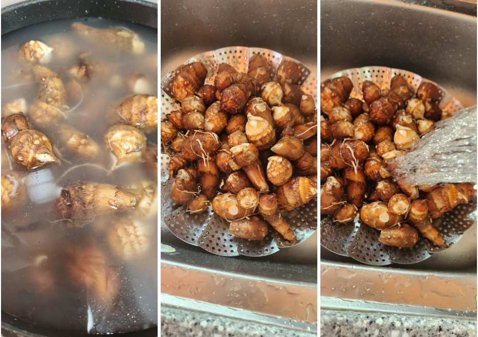 - 끓인 후 토란을 채반에 넣고 찬물로 헹군 후 식혀 줍니다.