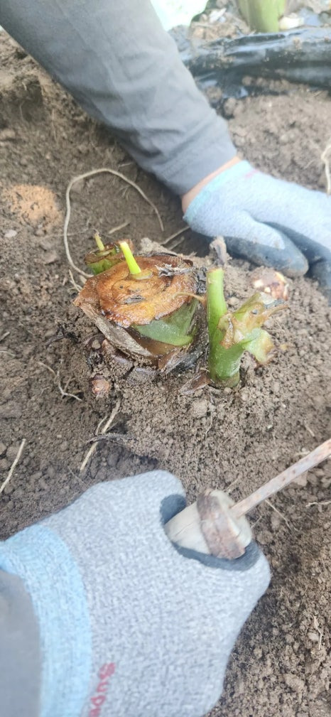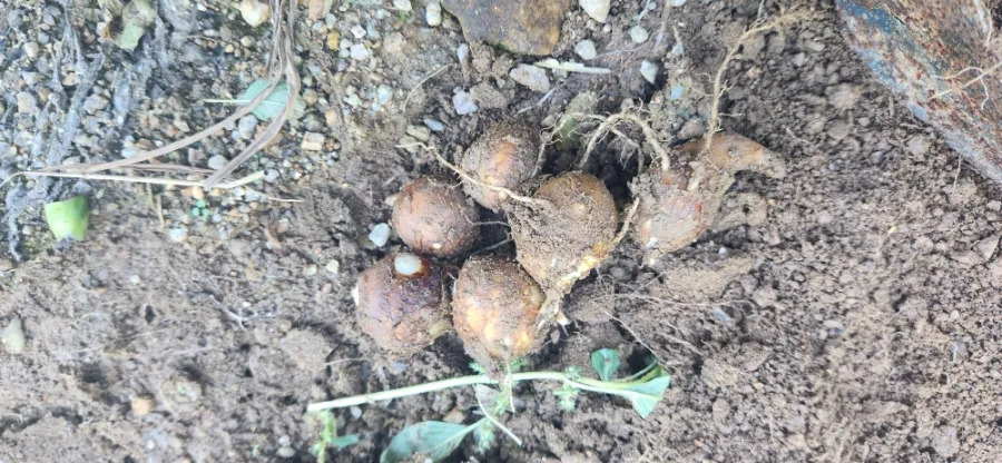 밑에 남은 줄기 아래를 파면 요렇게 토란 덩어리들이 줄기에 달려 있어요. 하나씩 떼어서 분리합니다. 토란은 촉촉한 습기가 많은 땅을 좋아해요.