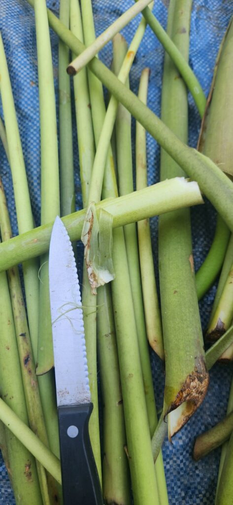 낮으로 밑동을 잘라 대를 분리합니다. 잎도 떼어내고요.