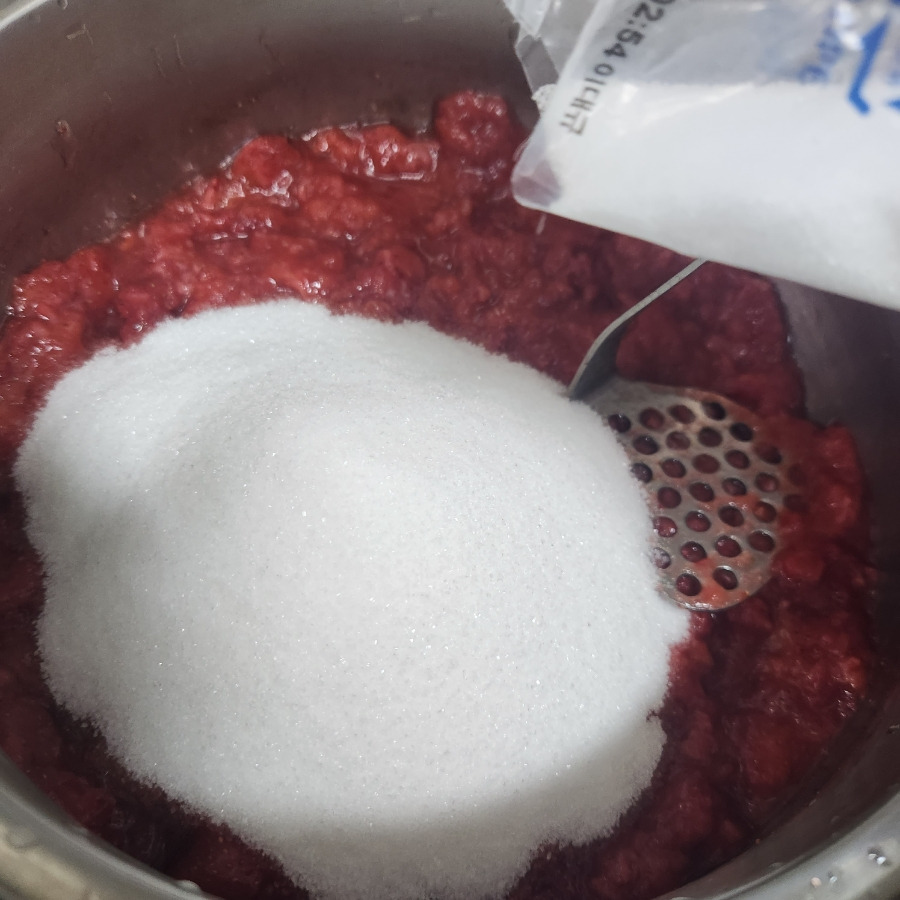 설탕을 딸기 무게와 1:1로 넣으면 됩니다.