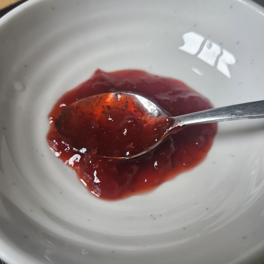 농도는 꿀보다 덜 진하게 만들면 나중에 식어서 딸기잼으로 먹을 때 바르기 쉬워요.